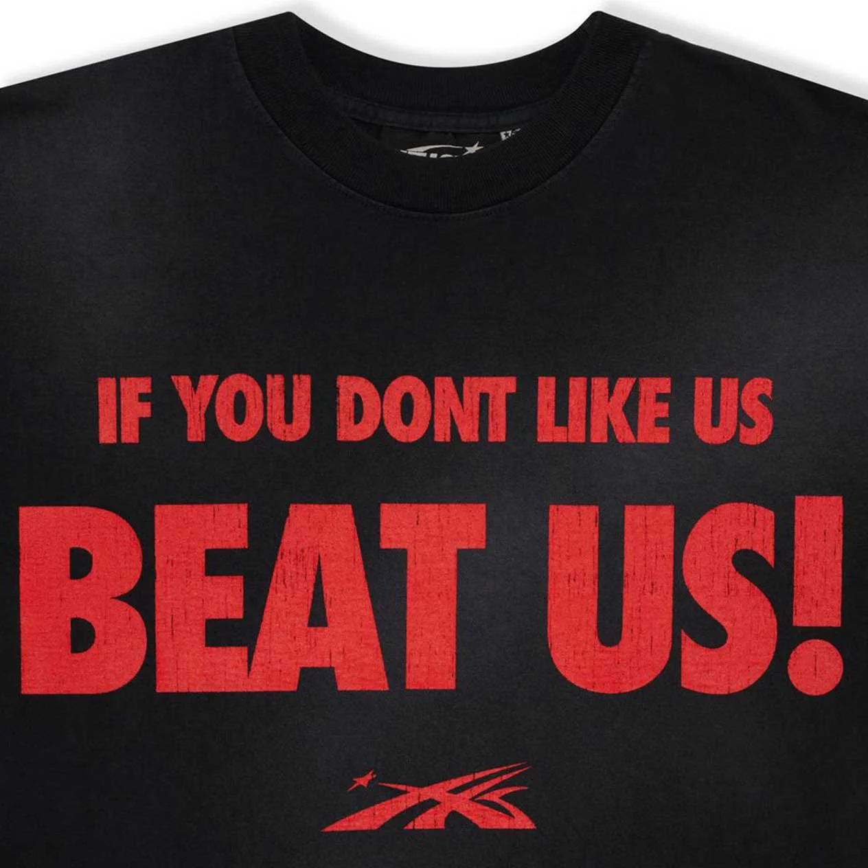 Turn heads with the Hellstar Beat Us! T-Shirt Red/Black, a bold graphic tee featuring contrasting colors and signature Hellstar typography.