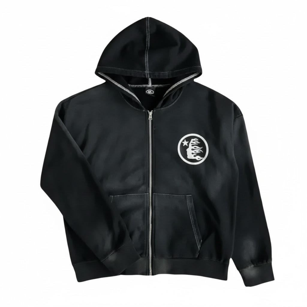 Discover the Hellstar Black Zip Up Hoodie, a premium FW24 piece dyed deep black and enzyme-washed for a subtly worn-in look. Made from midweight 350 GSM cotton-poly fleece, it features a contrasting white Hellstar “flame star” emblem on the chest, tonal flat-lock stitching, and a heavy-duty metal zipper. Adjustable hood drawcords, lined pockets, and ribbed cuffs and hem ensure everyday functionality and a tailored fit—your go-to layer for street-meets-sport style.