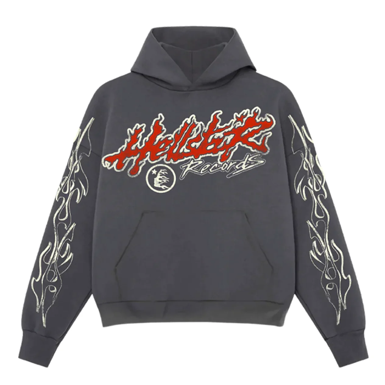 Bold red-flame “Hellstar Records” graphics blaze across the front, while tribal flame motifs scorch down both sleeves.
