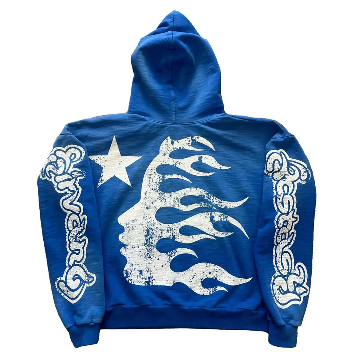 A bold, distressed “ॐ” motif centers the front, while tribal-flame accents and split-sleeve prints nod to Hellstar’s signature energy.
