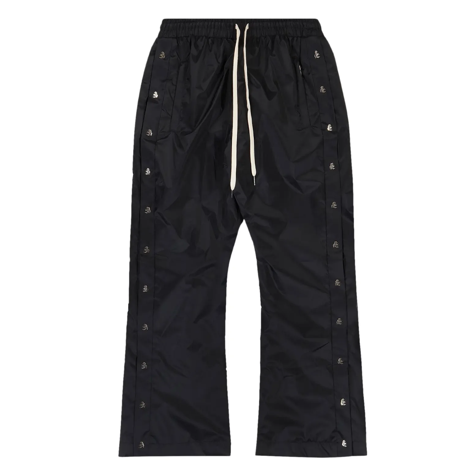 Introducing the Hellstar Waxed Nylon Pants in black—a street-ready staple with technical edge. Constructed from a durable wax-coated nylon shell, these pants feature snap-off side seams for versatile leg openings, an elasticized drawcord waistband for a secure fit, and tonal Hellstar snap detailing down each leg. Sleek slash pockets keep essentials at hand, while the water-resistant finish guards against the elements without sacrificing style.